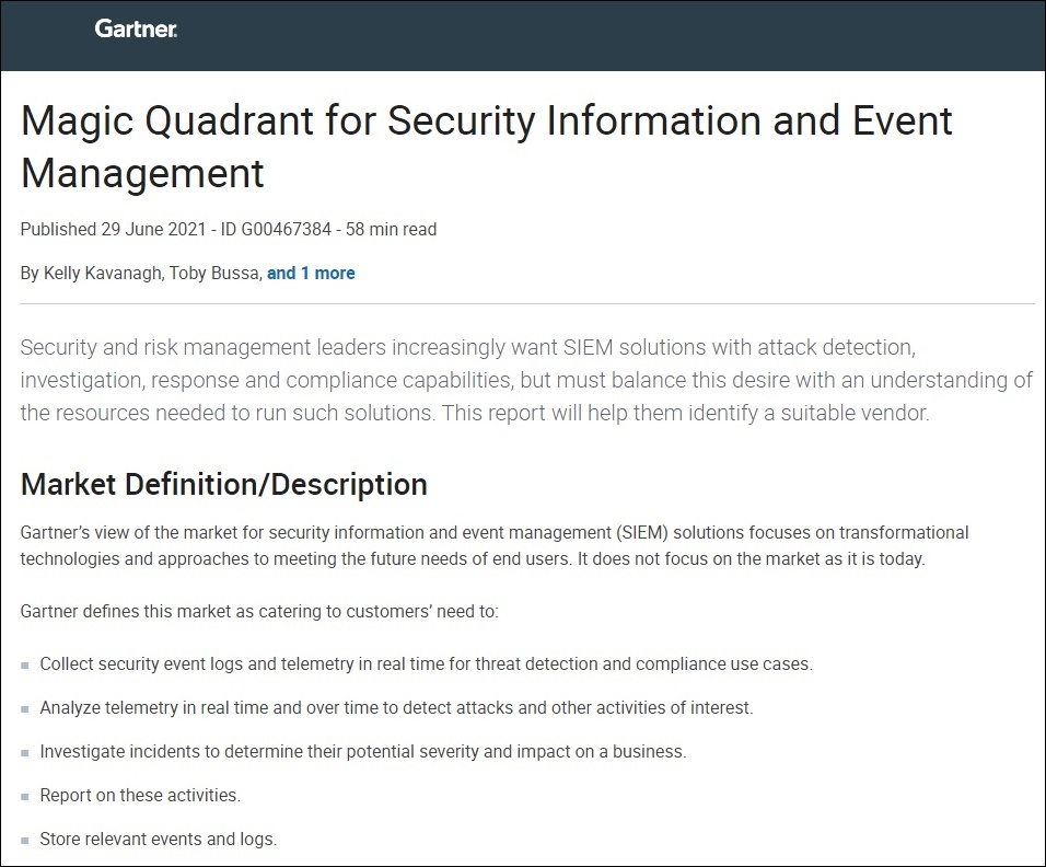 Gartner, Magic Quadrant for Security Information and Event Management, Kelly Kavanagh, Toby Bussa, John Collins, 29 June 2021.